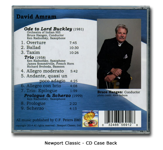 Ode to Lord Buckley was recorded in a single live performance in March 2006 with the Orchestra of Indian Hill, made almost twenty-five years to the day after the world premiere in March 1981 with the Portland Symphony, and reuniting the principals in that first performance, composer David Amram, conductor Bruce Hangen, and soloist Ken Radnofsky. The Orchestra of Indian Hill (www.indianhillmusic.org), is made up of Boston's finest freelance musicians, colleagues dedicated to high integrity music making, and of which dear friend Bruce Hangen is Artistic Director. Ode was my first commission, accomplished with the help of family and friends (parents Matthew and Eunice Radnofsky, uncle / aunt Joseph and Hilda Jacobs, and Irene and Andy Kulin); I am forever grateful to them. I would also like to thank Susan Randazzo, Executive Director of Indian Hill Music, for making possible the release of this recording. The Prologue and Scherzo was recorded in a short session at New England Conservatory's historic Jordan Hall in September of 2005 as I recall, and the Amram Trio is from a live concert at the same venue, Feb. 16, 2010, with colleages, Boston Syrnphon principals James Sommerville (horn) and Richard Svoboda (bassoon), in an 80/ 85th birthday year saxophone concert dedicated to the music of, and attended by, composers David Amram and Gunther Schuller.(a snapshot of the two is enclosed in the cd booklet as the two old friends, horn players, composers, jazz lovers, born in the same month, exchange current phone numbers. And, it was Gunther who first heard David playing jazz French horn in 1954 at the famed Jazz Kellar in Frankfort Germany in Germany and suggested David move to NY. In 1955 David studied French horn with Gunther at the Manhattan School of Music, and Gunther attended David's Town Hall concert in 1960, in which this 'Trio' was first performed.